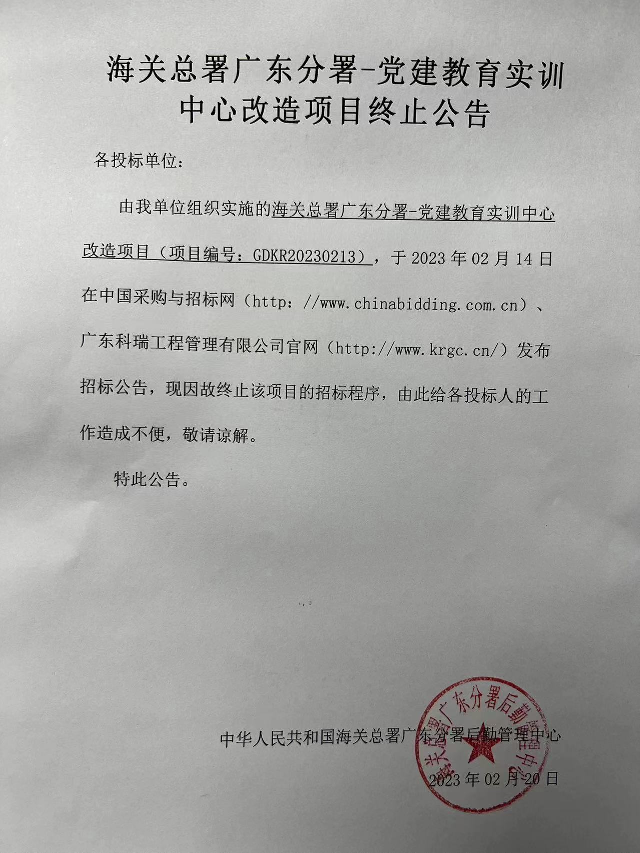 由我單位組織實施的海關總署廣東分署-黨建教育實訓中心改造項目(項目編號:GDKR20230213),于2023年02月14日在中國采購與招標網(wǎng)(http://www.chinabidding.com.cn)、廣東科瑞工程管理有限公司官網(wǎng)(http://m.xunlei-mz.com.cn/)發(fā)布招標公告,現(xiàn)因故終止該項目的招標程序,由此給各投標人的工作造成不便,敬請諒解。